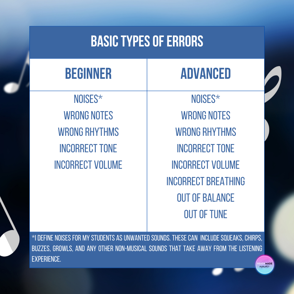 After recording, but before playback, I recommend listing for your students the types of errors you want them to hear. With less experienced musicians, shorter lists promote more targeted listening. Too many items will spread thin their attention. Below is a broad list of common mistakes—though there are many more and each could be more specific.
