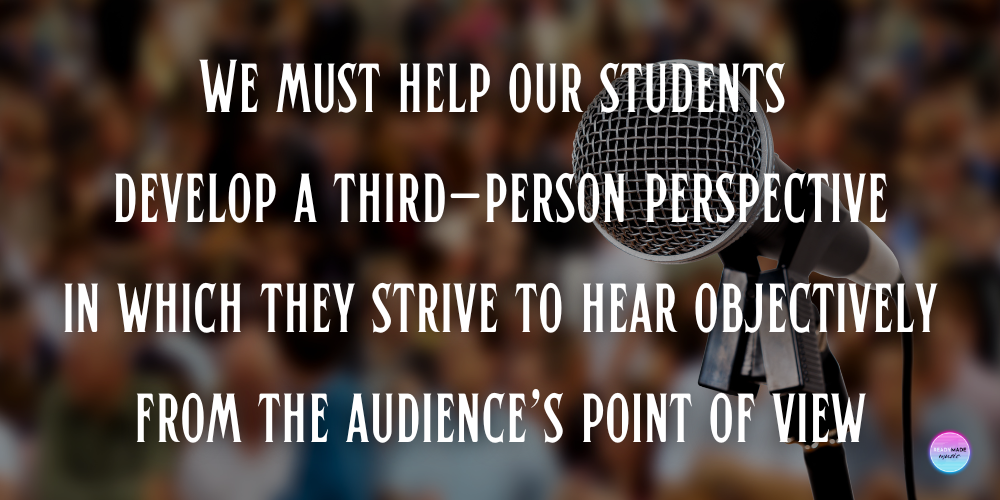 Like me in my garage band, they may simply not know. Even if we’ve told them—it’s often not enough. They don’t yet have the awareness to understand. They need to hear it to believe it, and the simplest solution is to record them and play it back. We must help our students develop a third-person perspective in which they strive to hear objectively from the audience’s point of view.