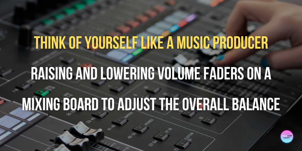 First, balance the musical lines by asking the melody to play by themselves. Then, layer in the non-melodic lines one at a time at volumes softer than the melody until you find your preferred ensemble sound. Think of yourself like a music producer raising and lowering volume faders on a mixing board to adjust the overall balance.