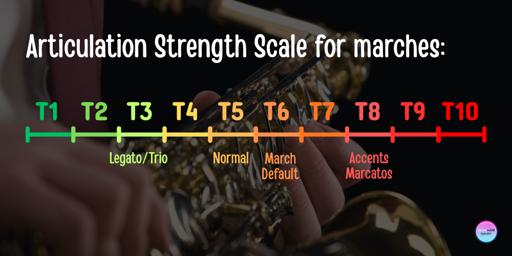To explain articulation strength, I use a numbered scale where T1 is the most light and gentle, and T10 is the most firm and accented. (The letter “T” stands for “tongue.”) I generally use T5 as our default strength, but in a march I’ll ask my students to increase their default to T6 to create a firmer front to each note. Then, I’ll have them use T8 for accents. We might also utilize T3 for a legato passage in the Trio.